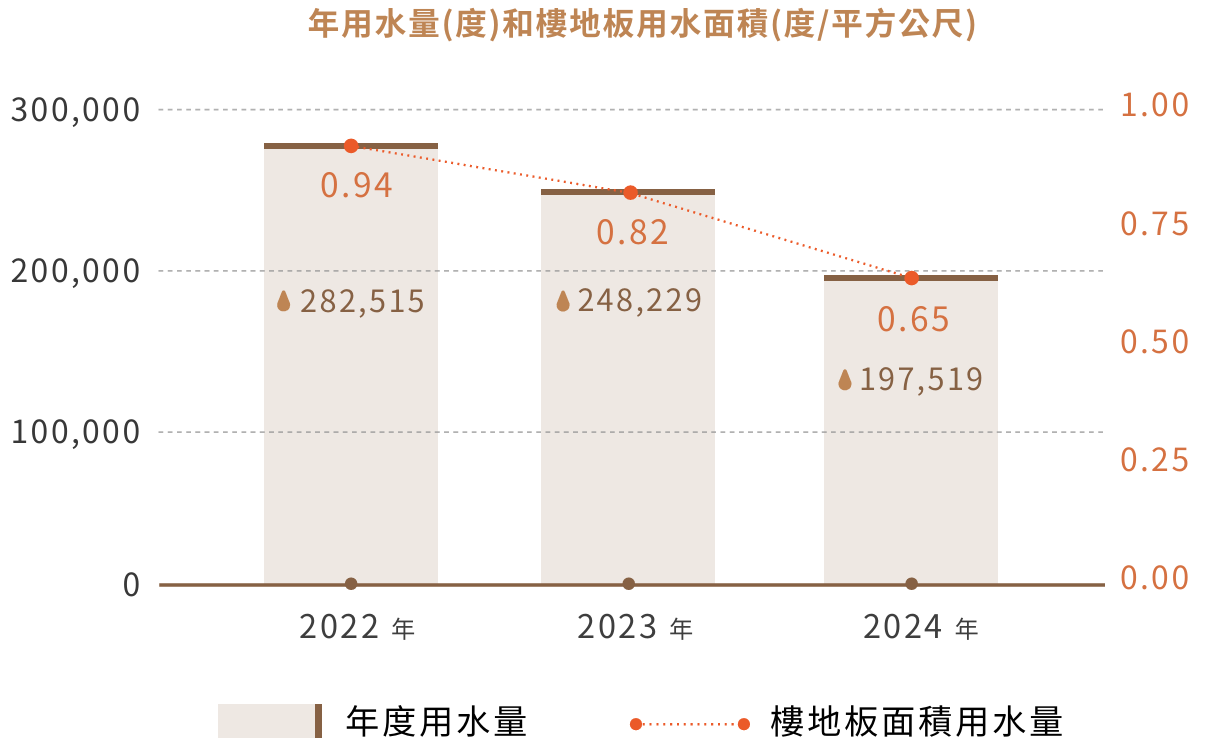 年用水量較前年減少20%,展現出有效的節水成果。因近三年樓地板面積並無增加,故使每平方樓地板面積用水量有上升趨勢,整體用水仍朝向減量目標邁進。