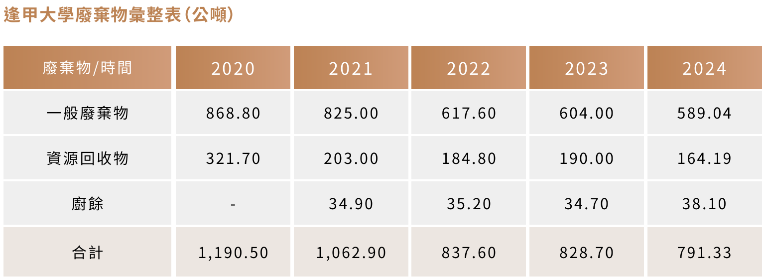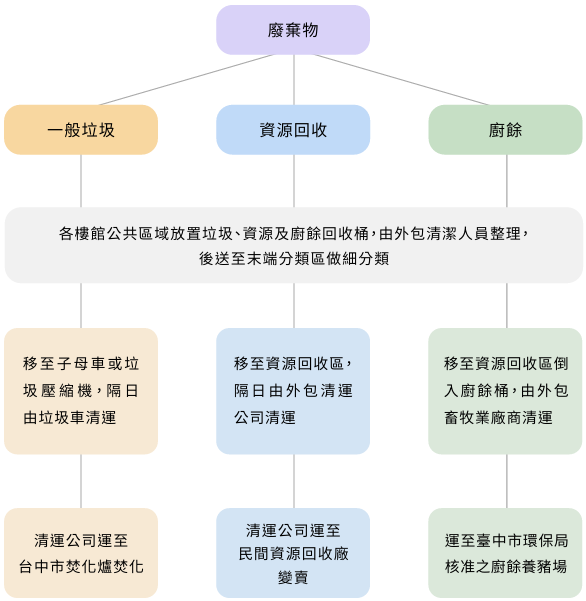 本校針對校園內產生的廢棄物,依其性質分為「一般生活垃圾」、「資源回收」及「廚餘」三大類,並於各樓館公共區域設置標示清楚的分類回收桶,引導師生依類正確投放。每日由外包清潔人員進行初步整理後,統一送至校內末端分類區進行細部分類作業,確保資源妥善回收再利用。完成分類後,再由具合格資格之外包清潔公司進行定期清運作業,落實垃圾減量及資源循環再利用之目標,提升校園整體環境品質與永續管理效能。