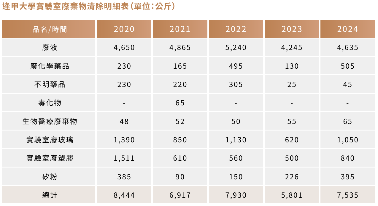 為兼顧實驗室教學品質與資源節約,本校有效控管採購與使用量,降低囤積風險,從圖中可見廢棄物處理量呈波動式下降,在不影響教學的前提下減少實驗室廢棄物產生。