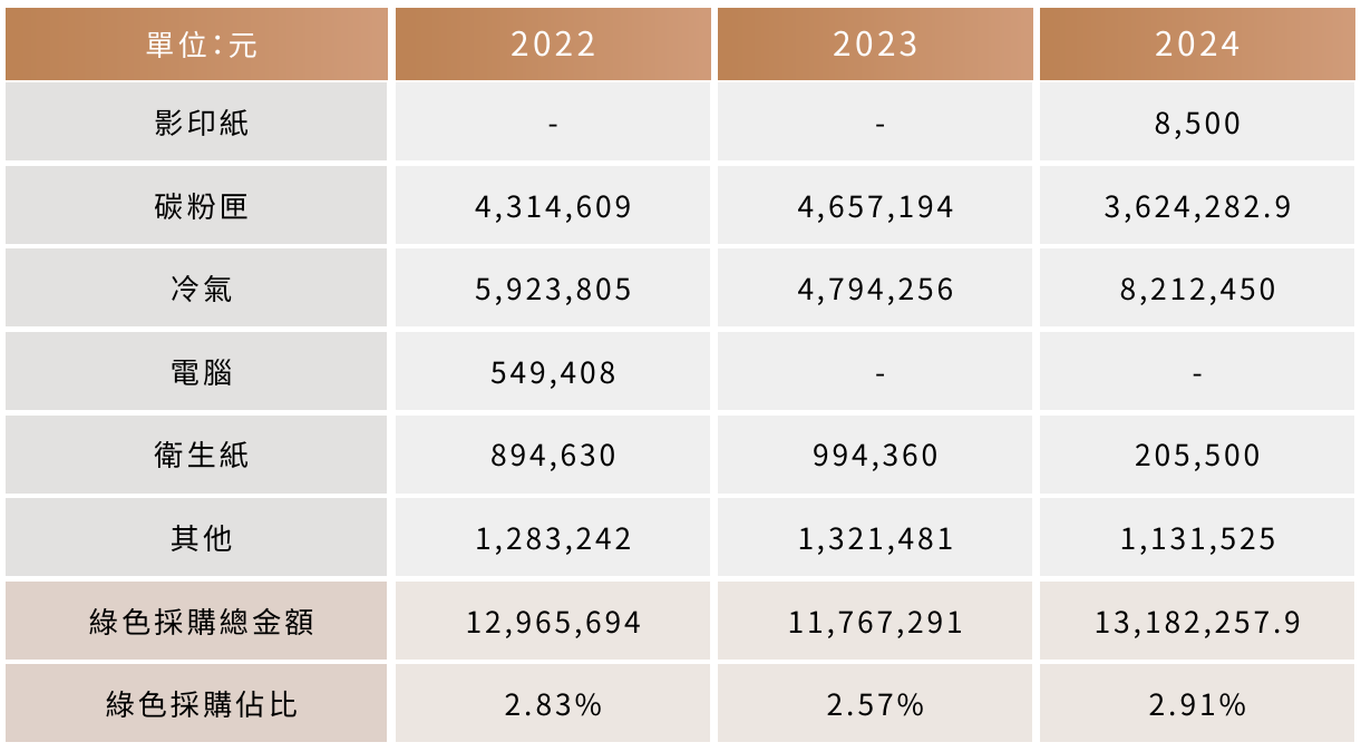 逢甲大學優先考量採用具環保標章、第二期環保標章、節能標章、省水標章、綠建材標章與減碳標章,或曾獲環保獎項之廠商所提供之綠色產品,並建立綠色夥伴商情資訊管理系統,以系統化管理供應商資訊。