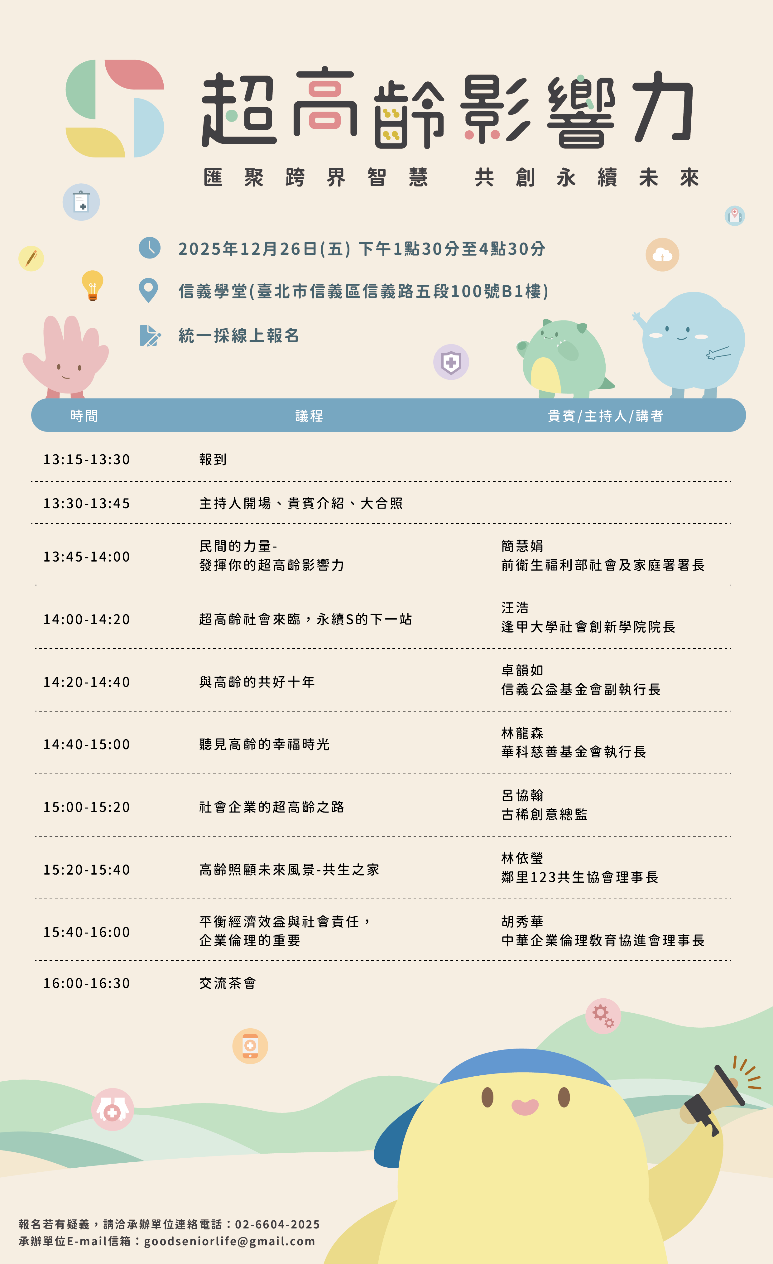 2025年,台灣正式邁入超高齡社會。這不僅是人口結構的轉變,更是重新定義社會價值與企業責任的關鍵時刻!社會創新學院汪浩院長受邀於114年12月26日舉辦「2025超高齡影響力論壇」上發表。此論壇匯聚公部門、非營利組織、基金會與學術單位的專家學者與實務工作者,從「民間力量」、「永續發展」、「社會企業到「共生之家」等多元視角,深入探討。在超高齡社會的挑戰下,民間組織的角色不再只是補足政府資源的延伸,而是成為強化社會韌性的核心力量。
