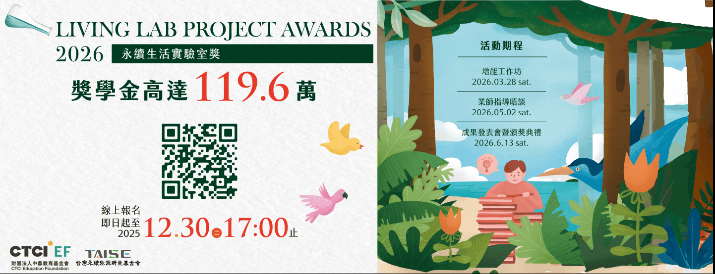 面對氣候與環境變遷、社會包容性降低及經濟發展挑戰,「如何運用知識與創意,轉化為推動永續發展的行動」,已成為高等教育的重要使命。財團法人中鼎教育基金會自2019年起舉辦「永續生活實驗室獎(Living Lab Project Awards)」,期盼鼓勵青年師生以「生活即實驗室」的精神,結合跨域專業與創新思維,提出解決校園、社會與全球永續議題的具體行動方案。誠摯邀請各位教授協助推薦貴系優秀學生組隊參加,一同引導學生以實作與創新思考落實永續行動,展現臺灣青年面對永續挑戰的創意能量。
